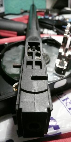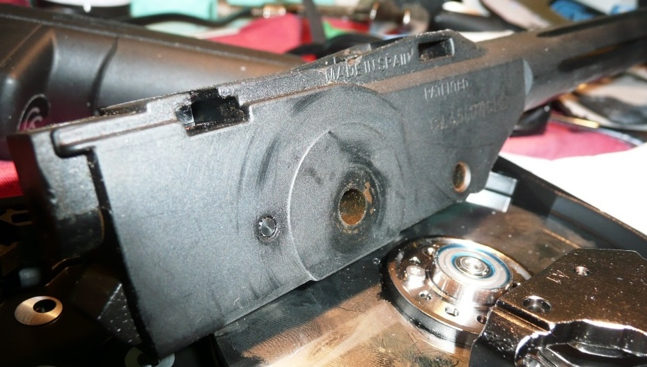 Quedaba un cañoncito realmente exiguo, con paredes de 2mm. Desistí de cualquier tunning........y eso que se trataba de un modelo de CO2 que no exige el esfuerzo de quebrar.