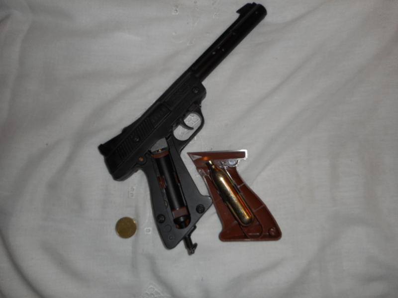 ES UNA PISTOLA MUY BIEN CUIDADA, FUNCIONA CON BOTELLINES DE GAS CO2 DESECHABLES, DISPARA .144 O 4,5 DE BOLAS DE ACERO.