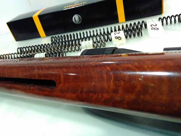 La carabina cometa fusion star en calibre 5,5 ( tiene pequeñas marcas del uso en la madera que e intentado fotografiar , pero nada grave ) , y tiene colocado el muelle de 24 julios.