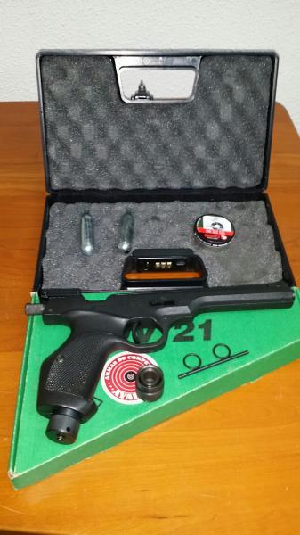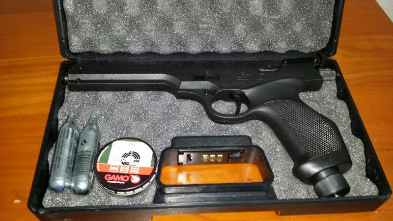 El arma está impecable e incluye lo que se ve en las fotos: pistola, dos juegos de tapones con sus juntas, dos juntas de recambio, un par de botellas de co2 y una caja de balines gamo para poder probarla inmediatamente. También incluye el maletín rígido con cierre de combinación, la caja de cartón original y el manual de instrucciones (consistente en una hoja din-a-4).