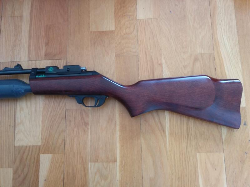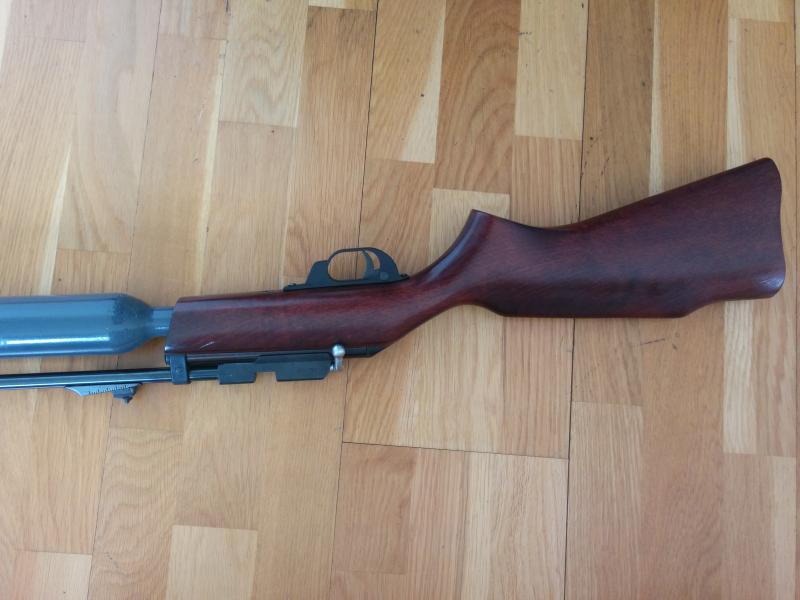 En perfecto estado. Sólo un pequeño arañazo que se ve en la foto de la parte derecha de la carabina. Literalmente sólo tiro hasta que se gastó la borda e gas y jamás se relleno de nuevo. Incluyó gomas de repuesto para la junta y otros repuestos que me mandó el señor Cordovilla. Recuerdo que tiraba fantástico.