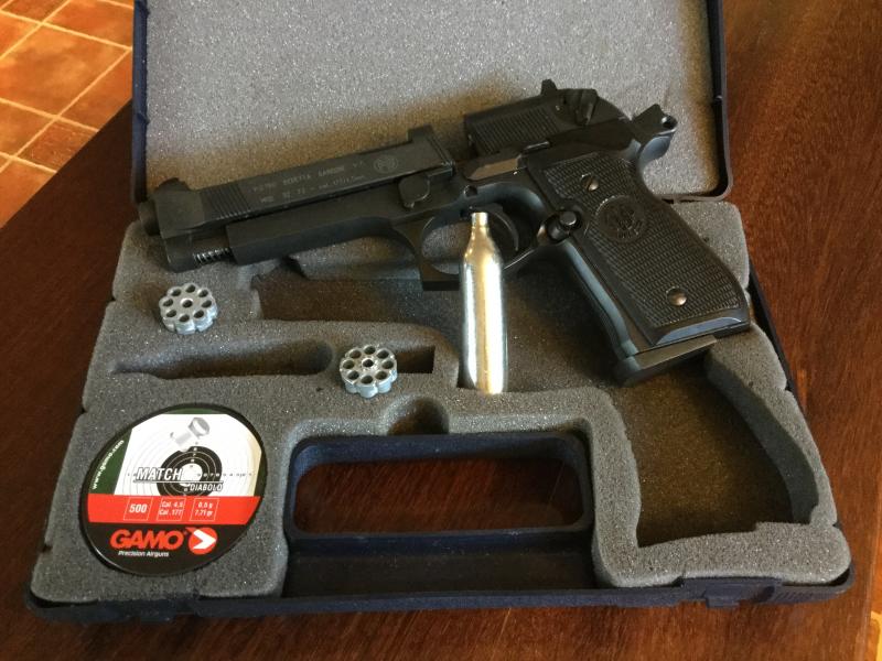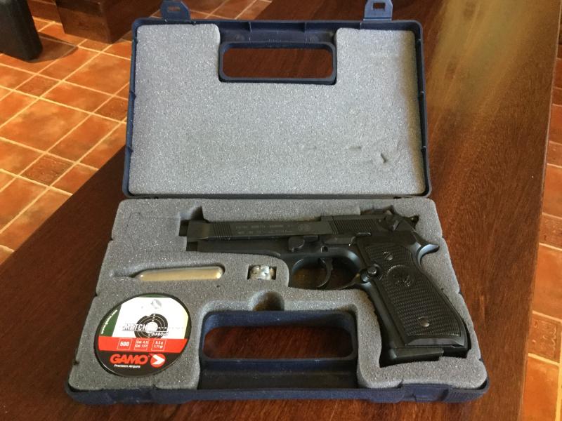 Pistola beretta Fs de CO2, en su maletin original,dos tambores de 8 balines cada uno y una caja de balines Gamo.