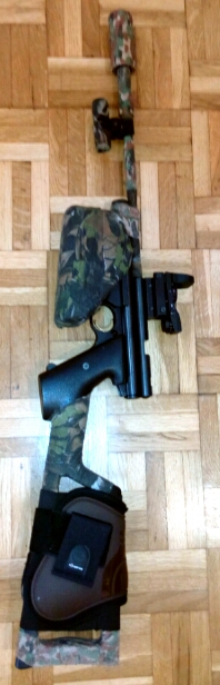 detalle del cañón con su soporte del laser de gamo y el supresor sónico acoplado, el supresor es muy eficaz y la deja muy silenciosa, ideal para disfrutar del tiro en lugares seguros, y sin molestar a nadie...