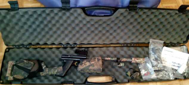 VENDIDA.....CROSMAN RATCATCHER 2250 del calibre 5,5mm de C02, con Breech metálico, gatillo mejorado, cañón de 18”, el cañón incorpora adaptador de rosca M10, para la inserción del moderador sónico que acompaño, lleva también un láser gamo con su correspondiente adaptador al cañón, en la culata lleva un adaptador de 5 botellas de C02, y una carrillera marrón, como elemento de puntería dispone de visor holográfico con 4 sistemas de puntería distintos, además de intensidades. El arma se vende con su correspondiente maletín de transporte mediano de 121x26x9 cms, (caben como ejemplo la Crosman 2250 y otra Crosman 2240). Regalo recambios compatibles con las Crosman 2250 y 2240, tales como, cachas para convertir a pistola, gatillos, muelles, juntas toricas, tornilleria, breech de plástico, tapones, etc… El arma está en perfecto estado de uso, muy ligera, ideal para tirar en espacios reducidos con gran precisión, y sin apenas ruido. (La carabina esta en Valencia y se puede probar)