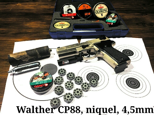 Hola Alberto, tengo una pistola Whalter CP88 niquelada en perfecto estado, lleva incorporado moderador con rosca en el cañon, que la deja muda, ademas va con 11 cargadores de 8 balines del 4,5mm, miras especiales micrometricas, aunque no es una pistola de competicion, es muy precisa...