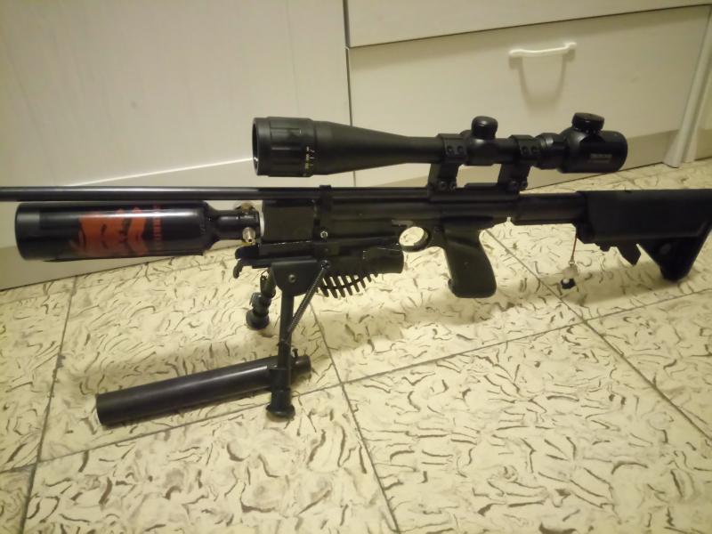 La carabina lleva depósito Guerrilla tarado a 110 bar, la ventaja de este depósito es que tiene el regulador integrado y regula mediante un muelle helicoidal, no los típicos de pletinas.