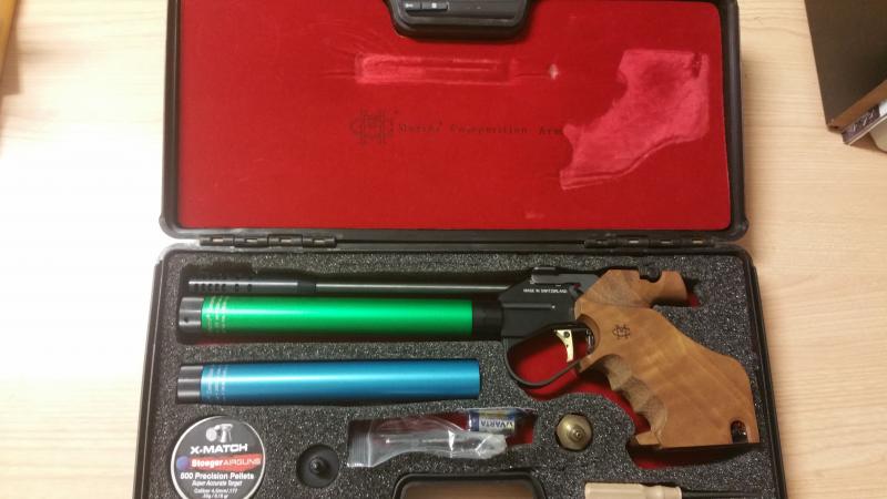 Arma en perfecto estado. Estuche original. Salvo la cajita de plástico en el que debían ir las herramientas, creo que está todo: contrapesos, dos botellas (200Ba) con manómetro incorporado, adaptador de carga, adaptador de descarga para las botellas, una pila nueva y destornillador.
