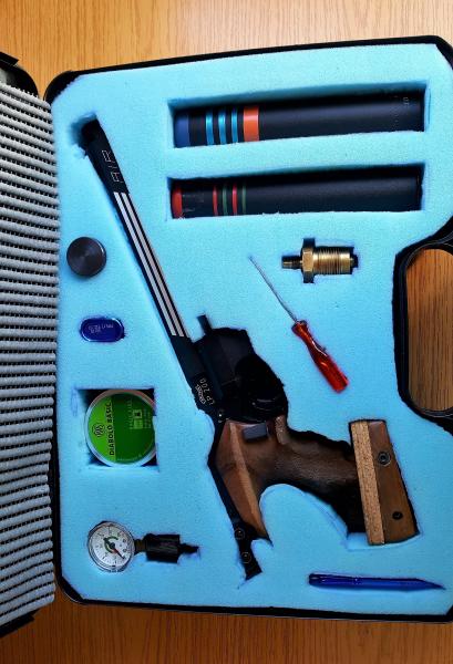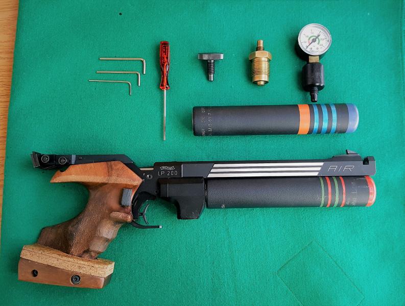 VENDO PISTOLA WALTHER LP200, PARA TIRO OLÍMPICO, CON 2 BOMBONAS DE 300 BARES, OBÚS DE CARGA, MANÓMETRO 01