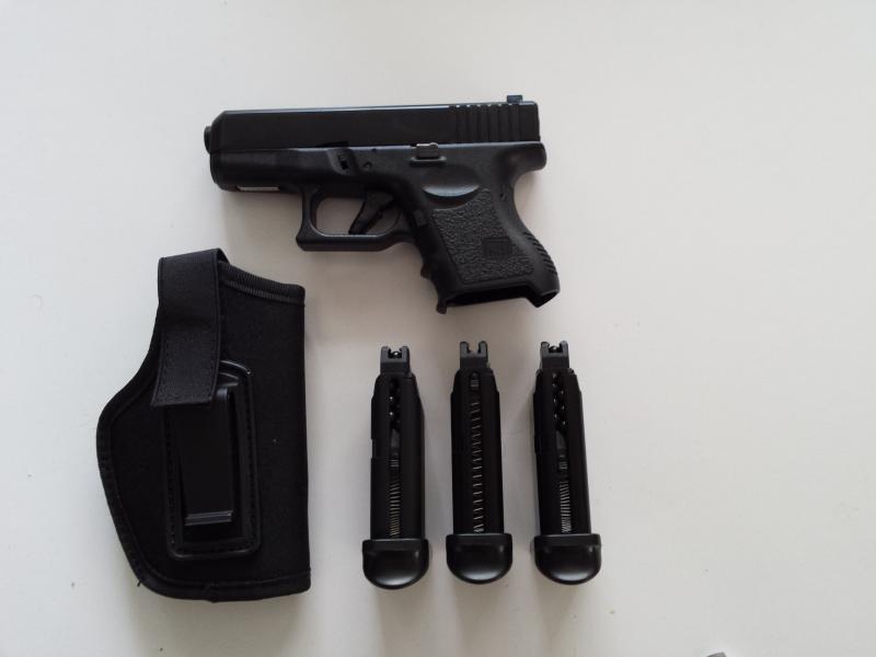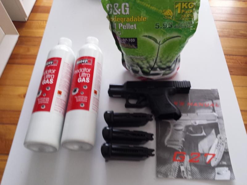 Kjw G-27 . REPLICA DE LA GLOCK. prácticamente a estrenar, es la cara, de corredera metálica Blowback, con 3 cargadores, funda, botellas y bolas. 95 euros. Cambiaría por cuchillo de caza asta de ciervo.