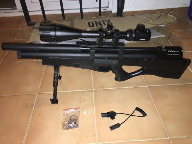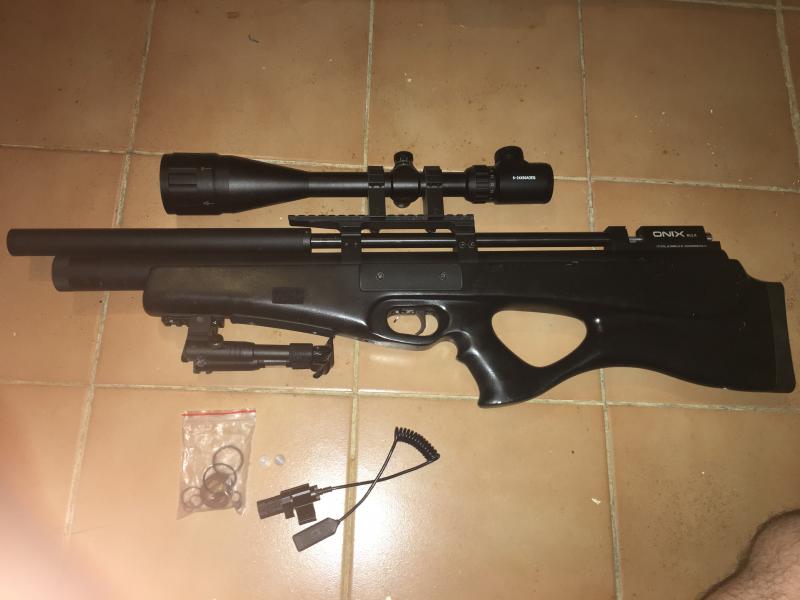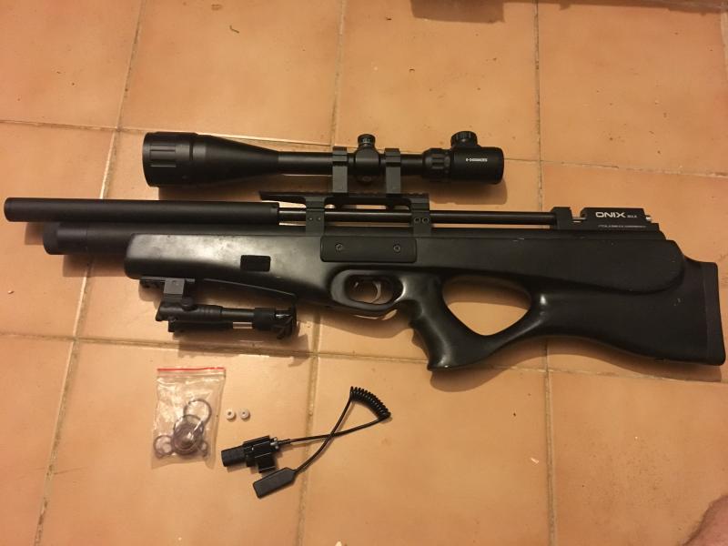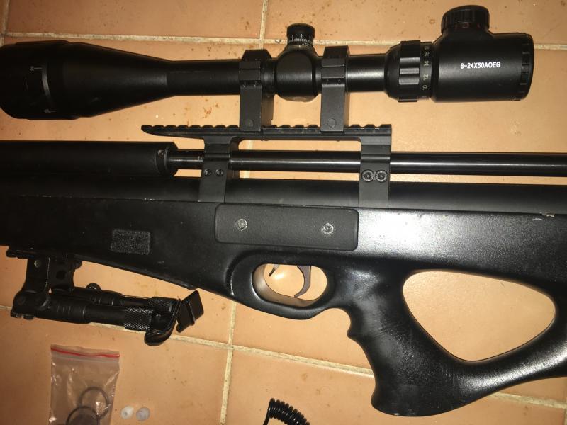Un amigo me a pedido que le ponga a la venta esta carabina contá de cargador monotiro y multitiro,bipode, puntero láser, visor de 24 aumentos con paralaje frontal, carrillera de madera para apoyar la cara, un juego de toricas y dos transfer adicionales para configurar diferentes potencias,