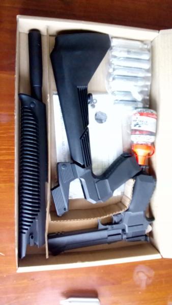El arma iría tal cual se ve en las imágenes con su caja , manuales y accesorios además de 12 bombonas de CO2 más un biberón de bolas metálicas.