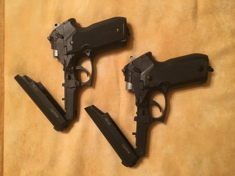 Hola buenas , pongo esta pareja de pistolas pt80, están usadas pero en perfecto estado ! Van con este maletín no es el original ! Incluyó de regalo atrapabalines marca gamo y dianas además de unas cuantas bombonas de recarga !