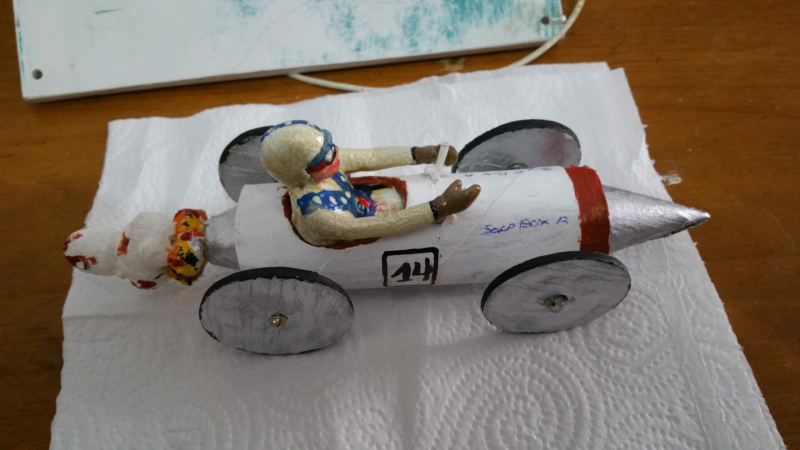 Hola . El soap box racer , esta hecho con un canuto papel wc. y un viejo conductor de un Ferrari 255 de jugetes PAYA que simula ser un niño con su ," cubo de jabon " , en una carrera . Saludos !