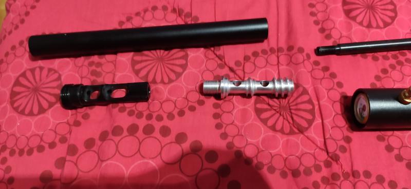 Adaptador de moderador para el cañon original a 1/2 unf mecanizado en aluminio y salida de gases en espiral, más las piezas originales claro.