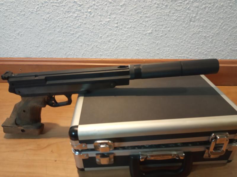 Pistola Gamo Compact, adaptada para silenciador (se sujeta con imanes), con maletín y contrapeso.