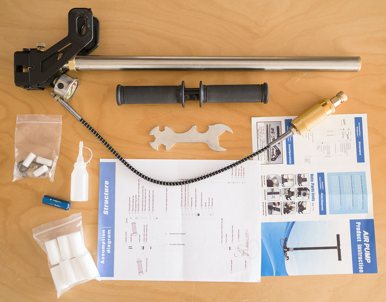 En la caja, aparte de la bomba, vienen los accesorios típicos : recambio de filtros, juntas, tapón para el conector Foster, llave multiuso, llave Allen y bote de grasa de silicona. También lleva un pequeño manual en inglés con traducción aceptable, para lo que suele ser habitual en los productos chinos.