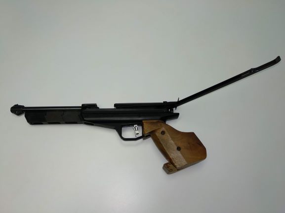 Pistola alemana de gran calidad. De acero y cachas de madera de nogal. No necesita bombonas, es de carga manual con palanca lateral.