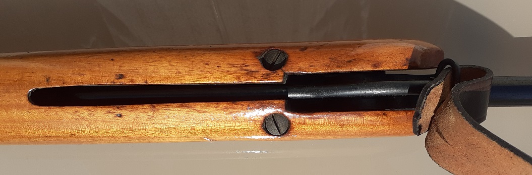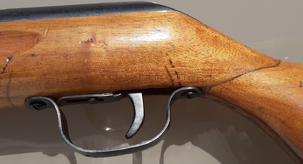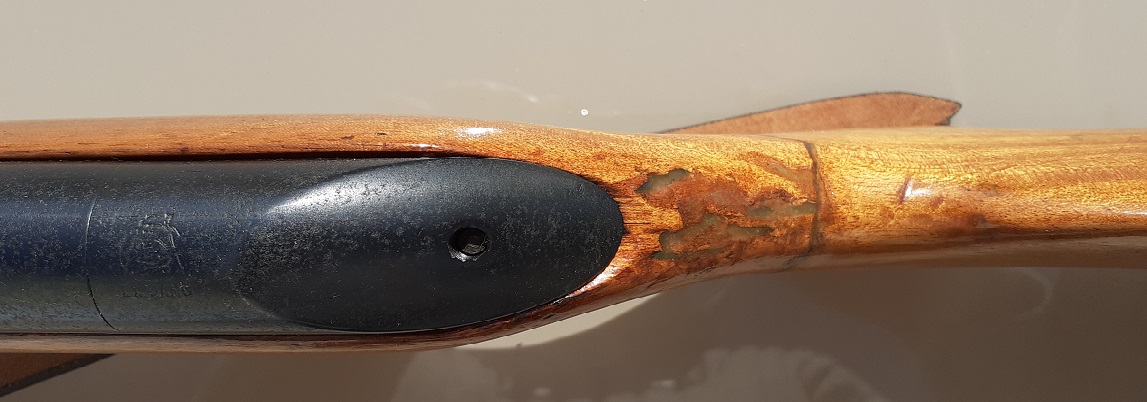 Perdon, pero habría que comentar que tiene el cañón torcido hacia arriba , se aprecia claramente en las fotos. Con el cañón quebrado en la posición de carga, accidentalmente se disparó y subio violentamente torciendose el cañón y partiendo la culata por la empuñadura.