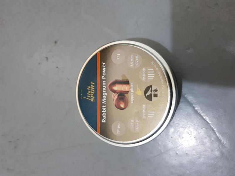 Vendo esta lata prácticamente sin usar de Balines H&N Sport Rabbit Magnum Power en calibre 4,5 mm, son aptos para carabinas de PCP, para las réplicas de pistola de CO2 que suelo usar son muy pesados.