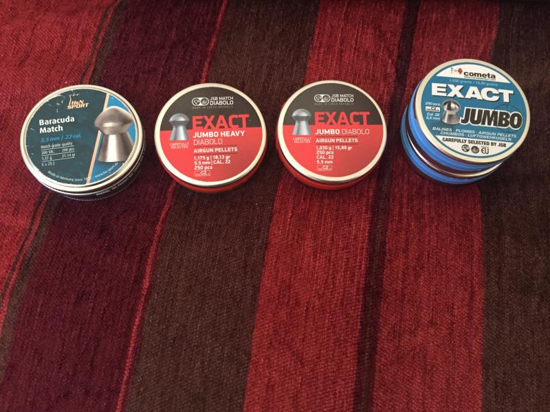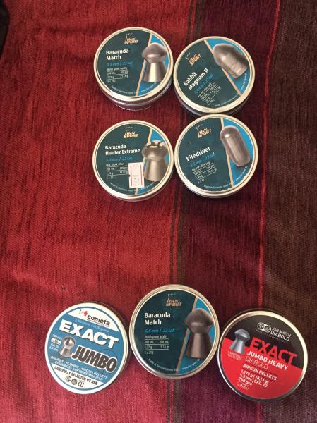 [*] 5 cajas de balines sin abrir: 1 de HyN Barracuda Match, 1 de JSB Exact jumbo heavy de 18,13 grains, 1 JSB Exact jumbo diabolo de 15,89 grains y 2 Cometa Exact jumbo de 15,90 (Fabricados por JSB)