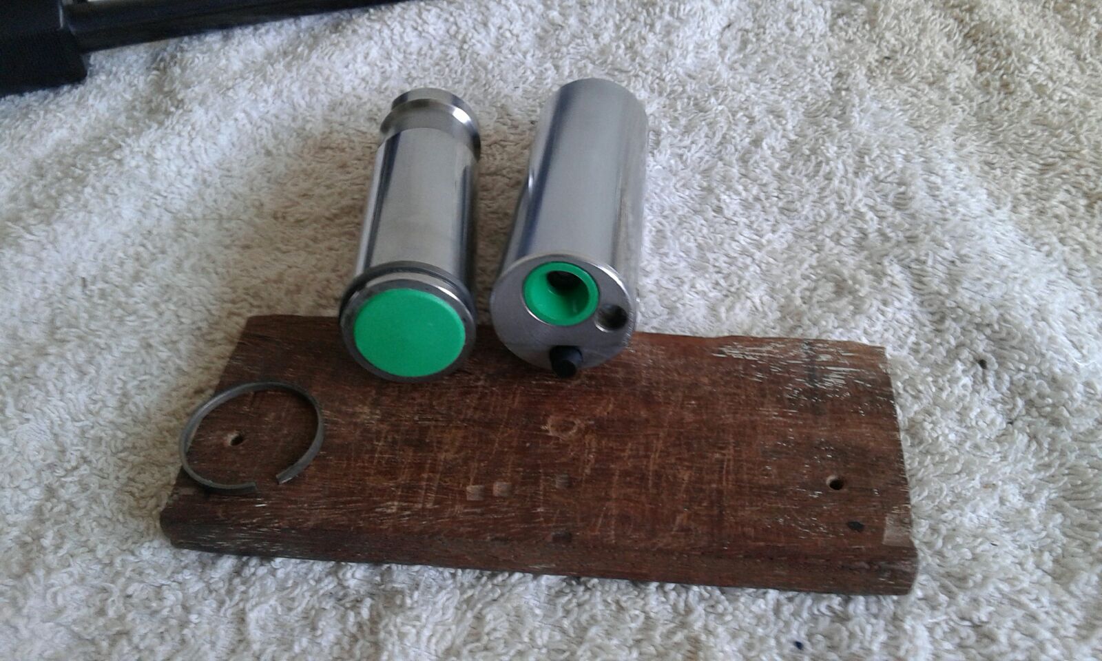Foto de piezas internas de desgaste cambiadas, muelle incluido. Aro de compresión nuevo montado en el pistón, al lado, el usado.
