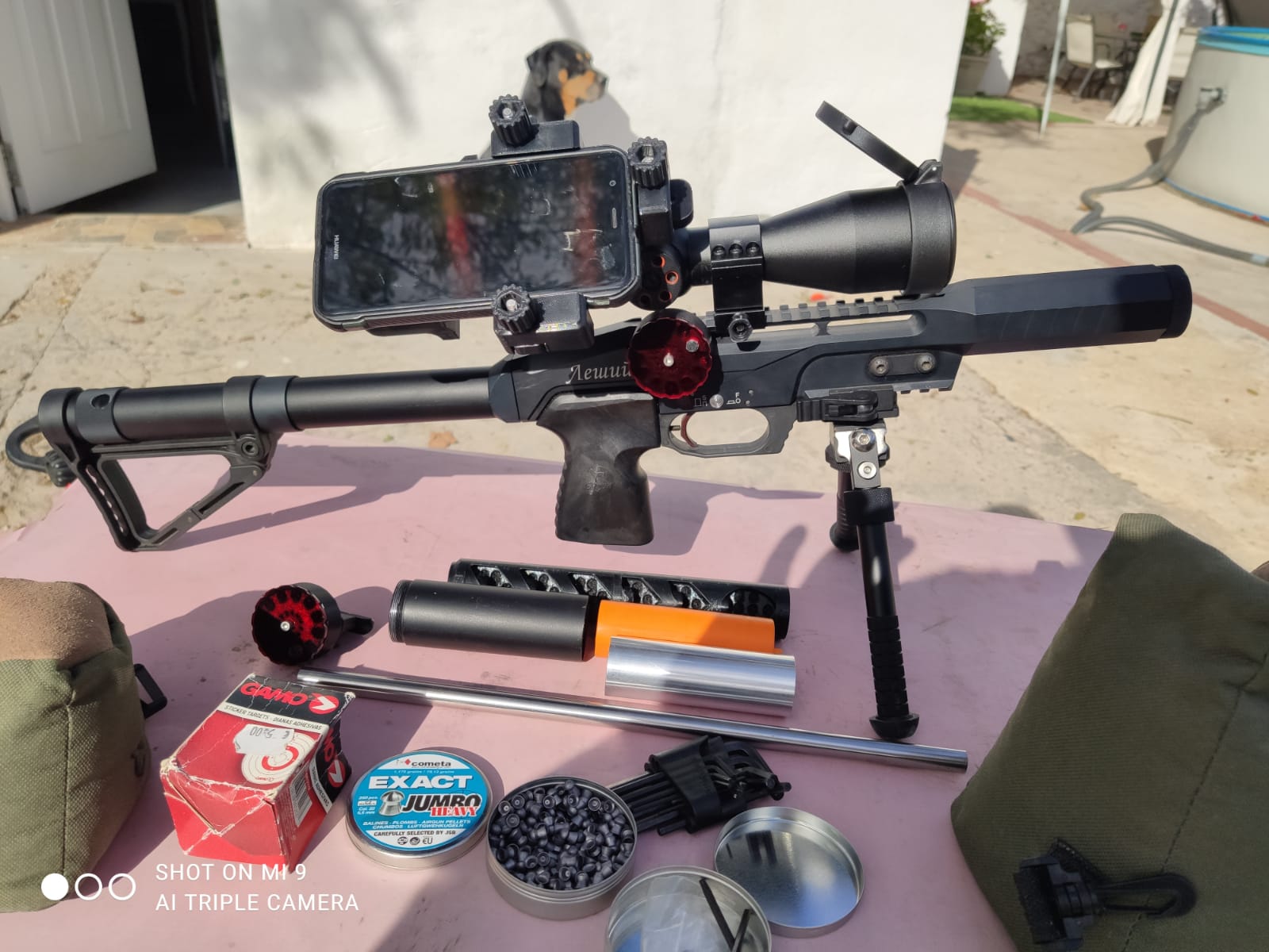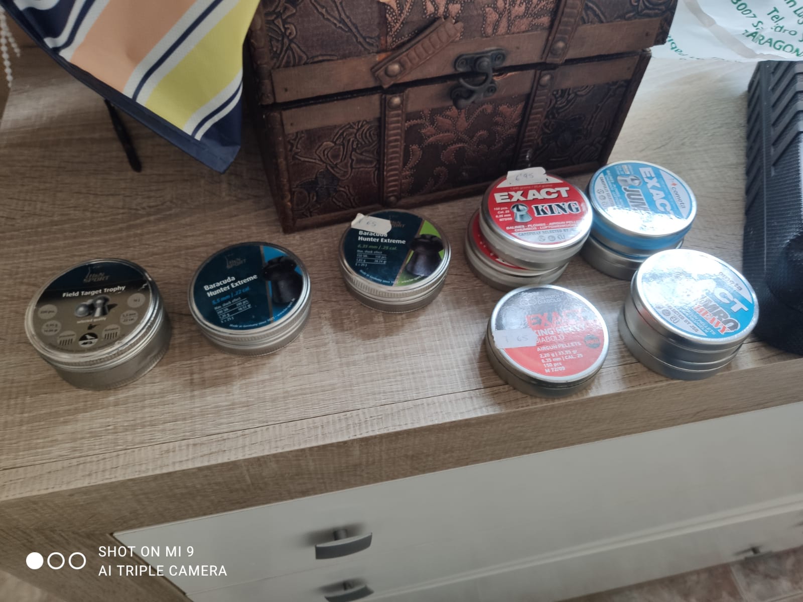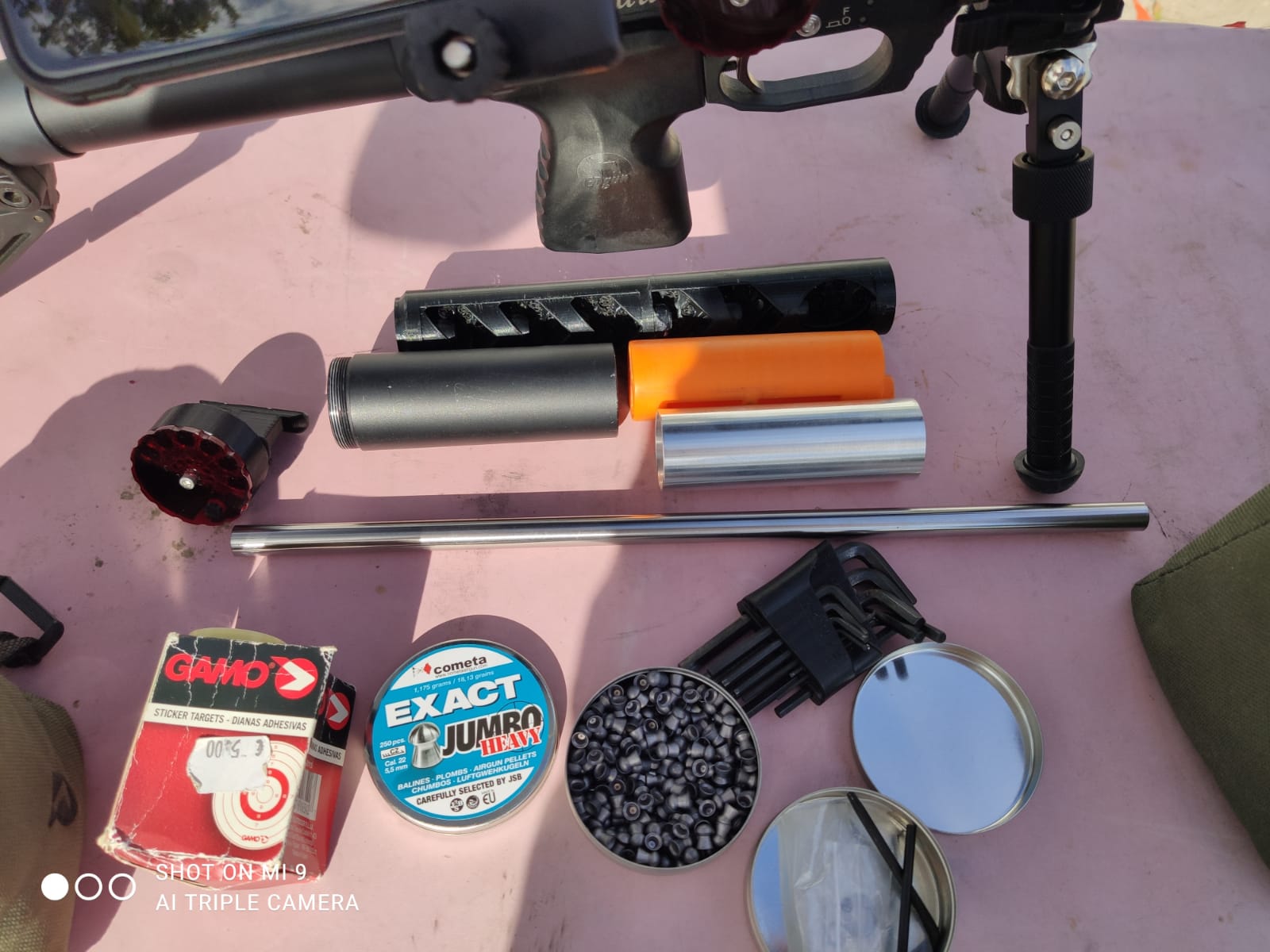 carabina con visor en calibre 5,5 con dispensadores de Rubén 3d slide shot no se si lo escribí bien osea el apartado de enganche para poder grabar con el móvil caja original y mochila tacita que entra justa plegada bipode harrys original alguna lata de balines no se si me dejo algo todo ello menos suba y visor discovery 150€ si se quiere añadir cañón de 6,35 de 35cm y prolongador 1300€