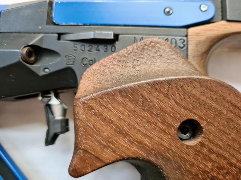 - Pistola para tiro de precisión monotiro, calibre 4,5 mm.