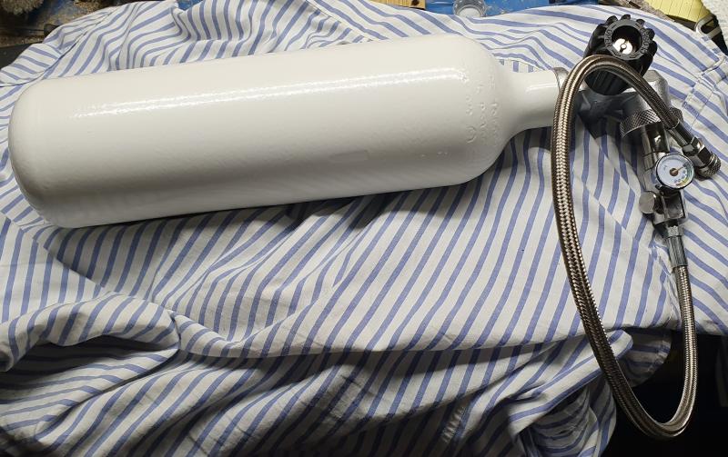 Inicialmente sin encomendarme a dios ni al diablo adquirí en fábrica (República checa) la bombona y su llave con idea de adquirir despues un compresor para llenar la botella y/o la carabina/pistola. Un buen compresor refrigerado por agua es bastante económico para plantearse su adquisición una vez se tiene la botella con su estación de carga para cargar en el campo.