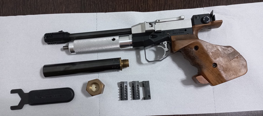 Vendo pistola de CO2 Feinwerkbau C5, de 5 disparos, con dos cargadores de cinco, y otro adicional de uno, una bombona de CO2, y adaptador de bombonas de CO2 de 12 gr., y cacha anatómica regulable, talla M pequeña o S grande, válida tanto para la modalidad de estandar como para pistola aire 10 m., muy cuidada y recien revisada, y puesta a punto, por armero profesional (bombona de CO2 también revisada y sin fugas).
