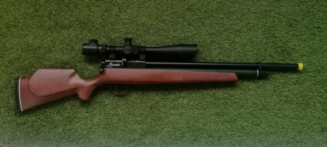 Rifle dual, aire comprimido, culata de madera segrinda, incorpora un manómetro en la parte inferior para controlar las presiones de trabajo, disparador y gatillo metálicos.