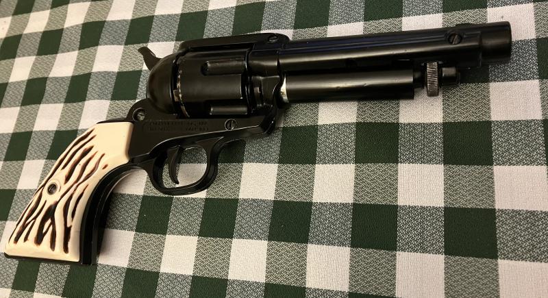 Hola pongo este revólver de acción simple de la marca Crosman, es de la década de los 60-70, accionado por co2 , las cápsulas se alojan debajo del cañón y se oprimen mediante una rosca, se cubren con una tapa quedando acultas. Calibre 5,5 , es completamente metálico con un peso de alrededor de 1 kilo, necesitaría cambiar el sello de la bombona, lleva los 2 juegos de cachas, el estado general es bastante bueno para su antigüedad, el precio 120€. Gracias