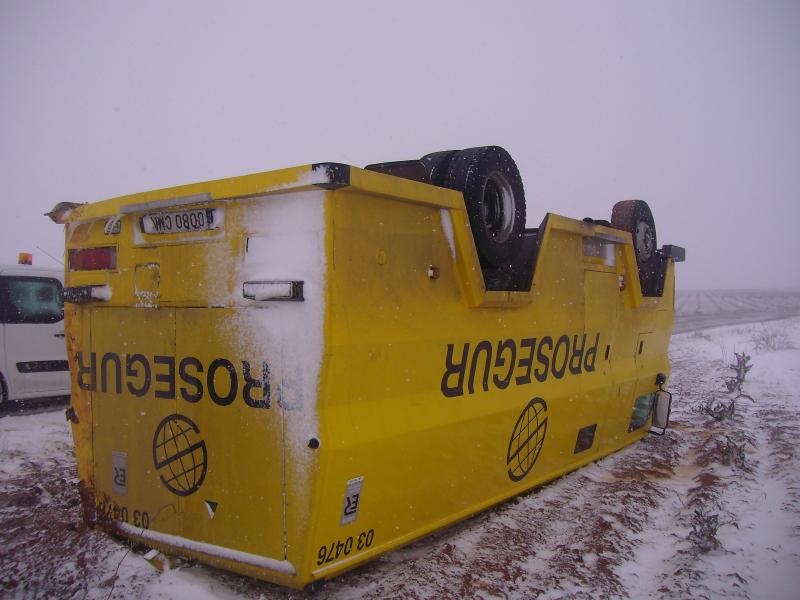 Pues eso, que unos compañeros estando de ruta en estos dias tan crueles de nieve y hielo pues se encontraron con una capa de hielo y adios el furgón una vuelta y patas arriba, gracias a dios que los vigilantes de atras llevaban los cinturones de seguridad puestos y no les paso nada y al conductor al centro de salud mas cercano con varios golpes en la cabeza pero afortunadamente nada grave. Mucha precaución estos dias tan jodidos. Saludos.