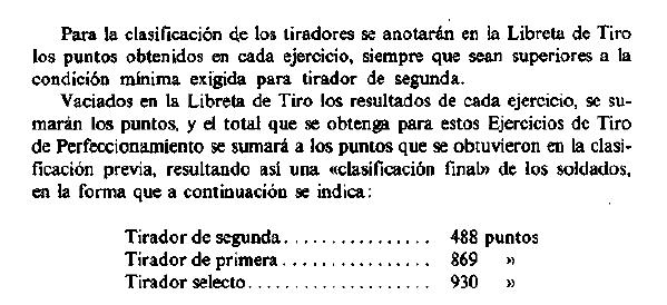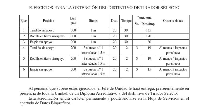 seleccionar al personal para los puestos tácticos de Tirador de Precisión con fusil. En las unidades tipo regimiento o unidad independiente, el jefe realizará, al menos una vez al año, un concurso de tiro con armas individuales para distinguir a los Tiradores Selectos. Podrán presentarse a esta prueba todo el personal que tenga superados y anotados en su Libreta de Tiro (y en su Libreta de Tirador) el número de ejercicios suficientes, con su arma en dotación, que justifiquen que está capacitado para participar en el mismo. La prueba consistirá en realizar los ejercicios marcados en cada uno de los manuales de instrucción de tiro con armas individuales y
