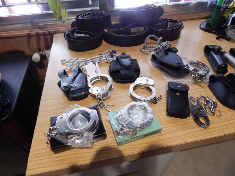 Vendo material seguridad, 5 cinturones, grilletes ( 4 de cadena,1 de bisagra, 3 de lazo, 1 de pulgares),4 defensas, cananas, fundas arma, equipación para tiro, etc. 150 euros lote.