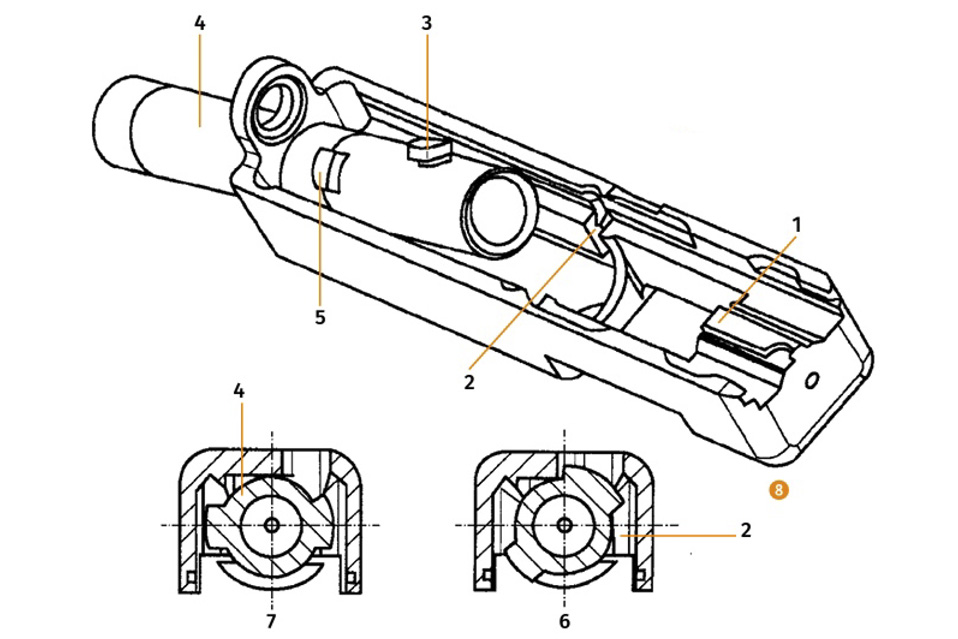Pero no he encontrado nada sobre el motivo que use el cañón rotativo, excepto que en general se le considera mas preciso y fiable, aunque hay mas desgaste en donde mecaniza. Por eso Glock insiste que ha reforzado esas partes para disparar 10000 cartuchos de alta potencia sin problemas. Además que no haga falta apretar el gatillo para desmotarla, y varias cosas mas.