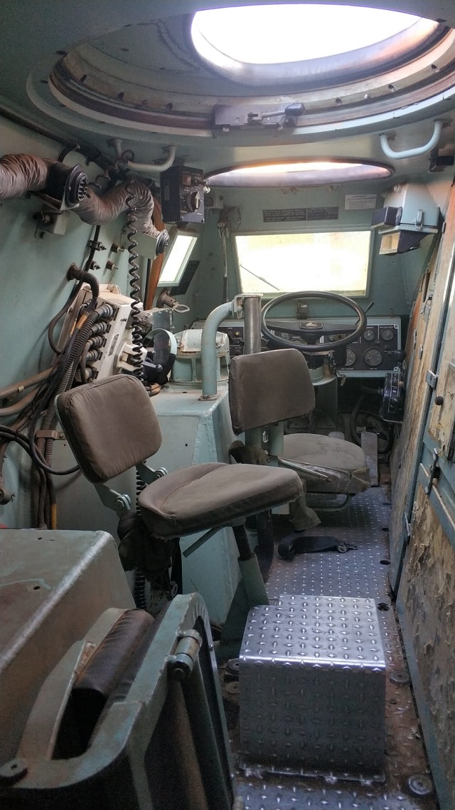 el interior del puesto de conducción, tampoco parece que difiera mucho de un vehículo comercial de la época.