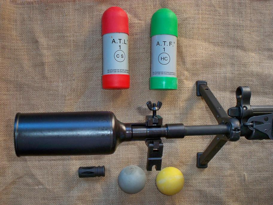 Los acoples ésos sirven para el lanzamiento de pelotas de goma y de fumígenos, se acoplan al cañón del arma mediante el procedimiento de sustituir la bocacha por un acople específico sobre el cual se sujeta el lanzador mediante una especie de abrazadera.