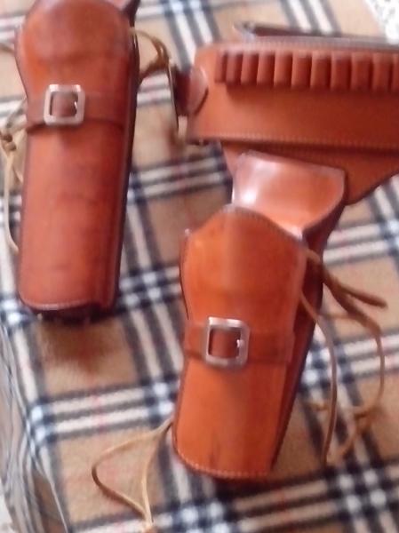 se venden estos dos cinturones con fundas de cuero marca bianchi en perfecto estado ,las estructuras de las fundas son metalicas forradas con el cuero , lo cual hace que no se deformen . en los cinturones se puede cambiar la chapa y como podeis ver las fundas son para un revolver 4 0 5 pulgadas y el otro para 7 u 8 pulgadas , construccion y acabado superior y el cuero doble , parece chapa de acero para doblarlo, son espectaculares. envio fotos detalladas a los realmente interesados . precio de cada juego 200 euros , los gastos de envio los pago yo.