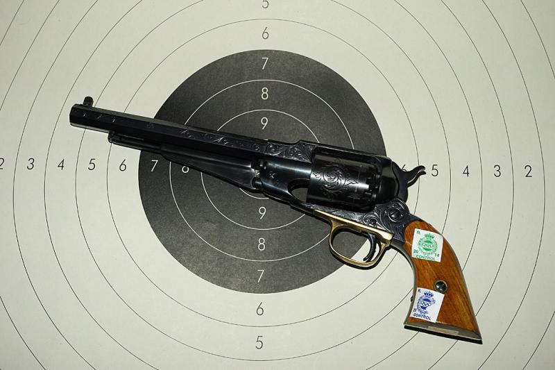 El revolver es el conocido Santa Bárbara en modelo labrado. Guiado el mismo día que la pistola. Está afinado por otro maestro armero-tirador de la zona, ya retirado de la competición pero que los iniciados conocen sobradamente. Calza un punto de mira Hege nuevo y listo para limar y ajustar a gusto del tirador. Ha sido en, al menos una ocasión que recuerde, campeón autonómico y primer clasificado en varias fases de Copa Presidente de temporadas anteriores. El arma está impecable.