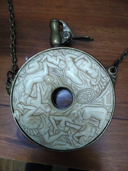 Se venda polvorera circular, probablemente su uso es para acompañamiento de uniformes de época. En perfecto estado, tal y como se ve en las fotografías. Desconozco cuando se fabricó.
