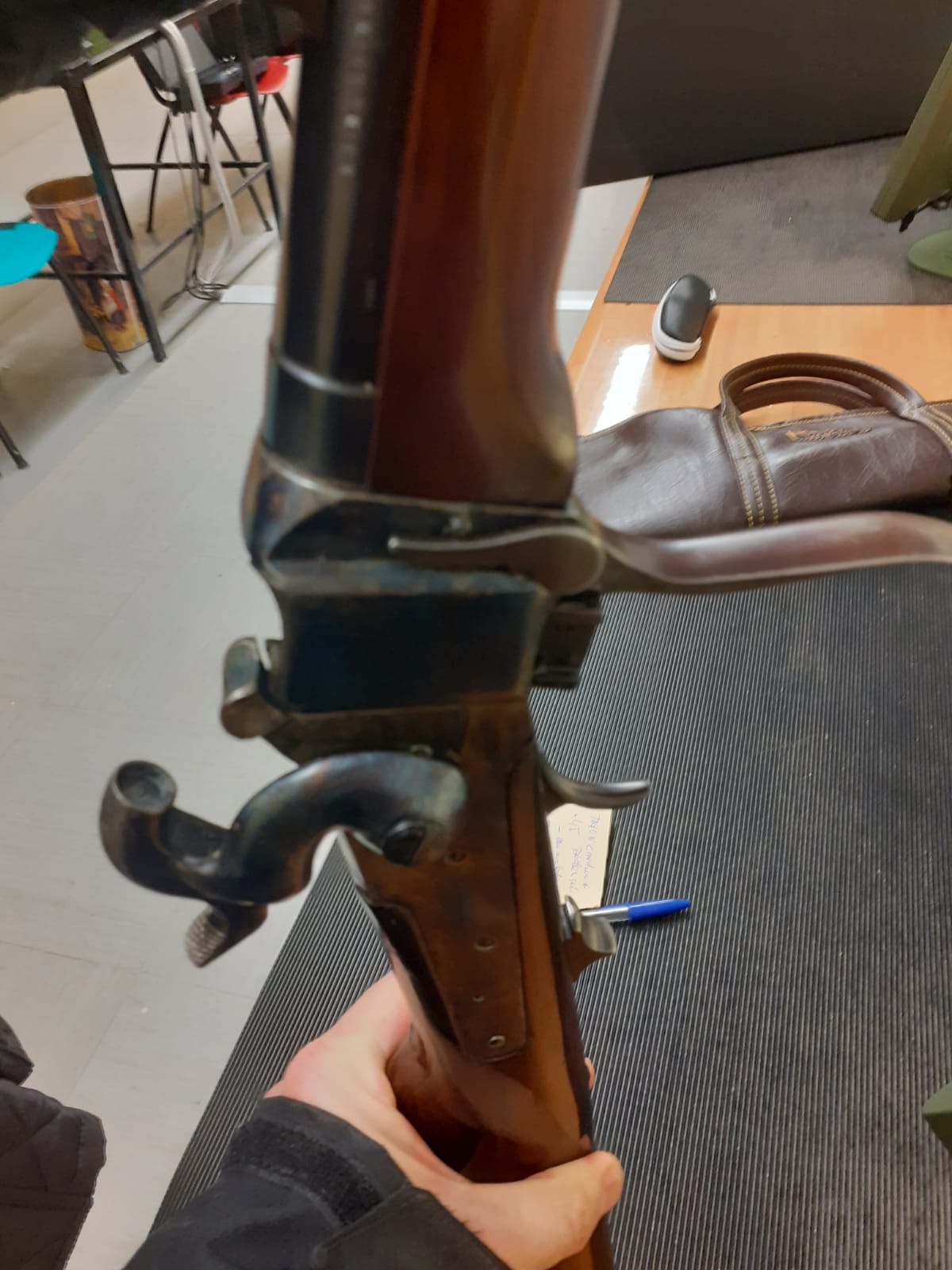 Le acompaña su turquesa y el utensilio para la fabricación de los cartuchos con papel.