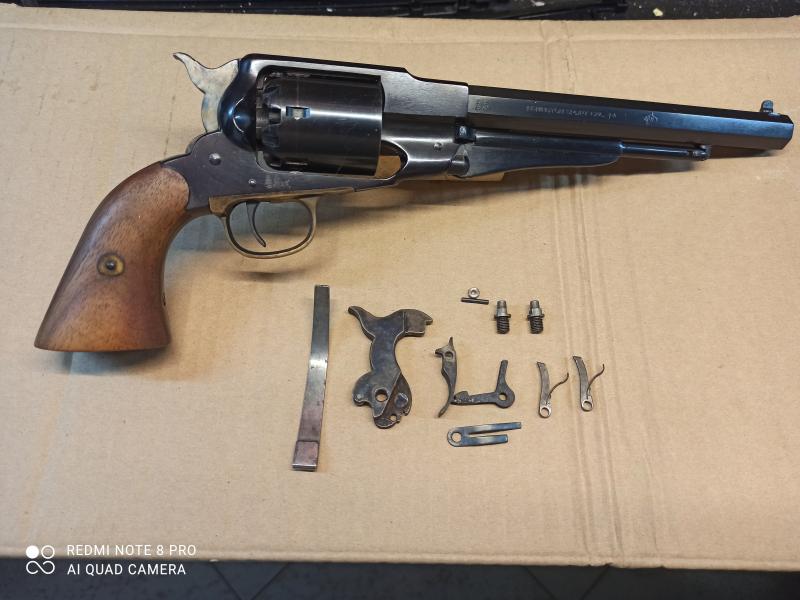 Vendo revolver Remington New Model cal.44 de Euroarms , punto de mira en cola de milano, y con los repuestos que aparecen en la foto, el estado general es bueno.