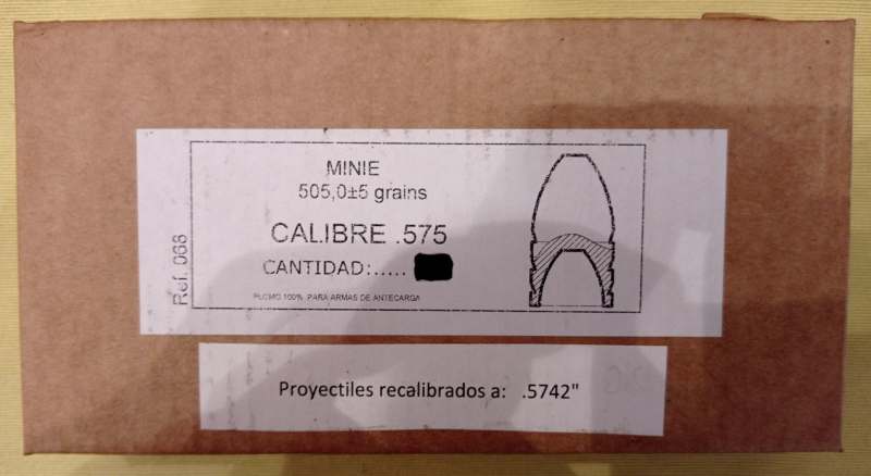 -Caja con unos cuantos proyectiles tipo Minie del calibre 58, diámetro 575, elaborados con turquesa Lyman, de 505 grains y recalibrados a 5742.