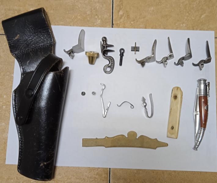 Un rastrillo de Ardesa nuevo, sin estrenar, para la llave del Pensylvania o arma similar. Un salvabocas para baqueta, un pie de gato y un tornillo pedrero de repuesto para llave de chispa de Kentucky Ardesa o Dikar. Un punto de mira para pistola Kentucky. 4 rastrillos Ardesa (estos están gastados, pero se pueden volver a templar o cementar). Dos oídos Ardesa (uno de ellos de Track of the Wolff) , Un muelle real para pistola de duelo Dikar. Un muelle de baquetero y un muelle de rastrillo para kentucky Ardesa. Un refuerzo inferior para adaptar a la parte baja de una culata de un Hawken hecho en hueso. Una navaja Albainox de 6 clics o muelles. Y una contrapletina de Track of the Wolff para adaptar a rifle Kentucky. Y en la siguiente foto un muelle real de cadeneta de escopeta (se puede adaptar a pistolas de avancarga con llave con nuez con cadeneta y dos muelles de fiador). Además un parachispas para poner entre la bombeta y la chimenea (también de Track of the Wolff).