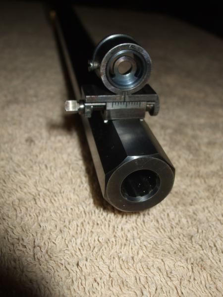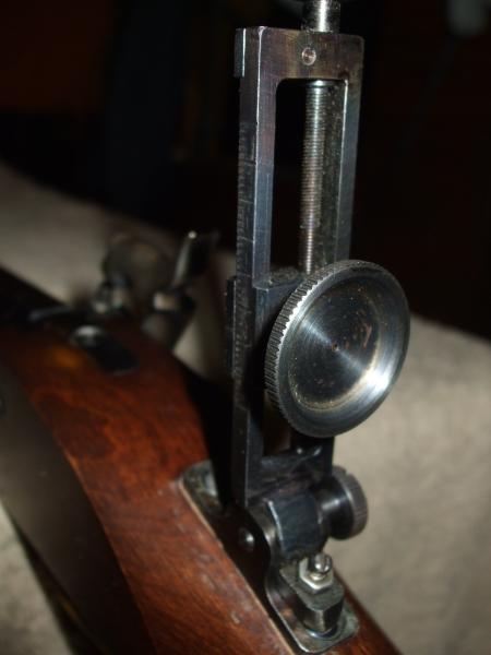 Entonces le comenté el problema a D. Eduardo Fernández y se decidió montar un diópter de fabricación suya tipo "vernier" ajustable en altura con la rosca protegida en el interior del armazón y escala lateral, haciendo un cajeado en la culata del arma. Se complementó la operación añadiendo un punto de mira de los de su fabricación también, montado en la cola de milano que poseia el cañón y siendo regulable en deriva con una llave de cuadradillo. Está colocada una retícula para el tiro a 50 metros.