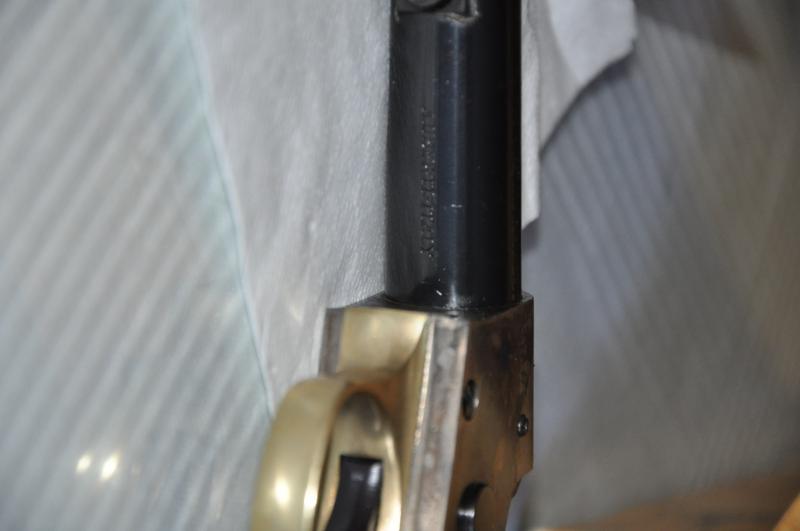 La marca esta bajo la madera, en el cañón por la cara donde esta el alza pone 45 Colt y en los laterales los números de serie y los punzones del banco de pruebas.