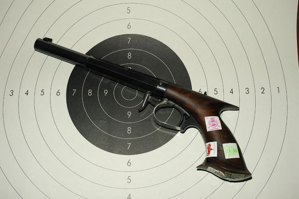 La pistola es una Feinwerkbau History num. 1 con fecha de expedición de guía abril del 2004. El cañón fué recortado en su día a 203 mm contados desde la boca hasta el centro del eje de la chimenea con el fín de acercar el centro de gravedad a la mano del tirador. La operación fué realizada en dos fases por un reconocido maestro armero-tirador de la zona. El palmares de este arma entre otros es haber conseguido un Campeonato de España y alcanzar en dos ocasiones los 100 puntos, fuera de España en una ocasión y en tirada social en mi club en otra. Conservo los correspondientes certificados y diplomas. Tiene otras marcas destacadas de menor rango.