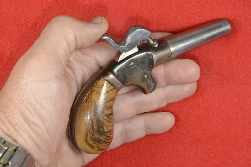 Preciosa pistola de bolsillo, cachorrillo de pistón Cal. 35 (8,90 mm.), hacia 1850. Cañón de acero ánima lisa y empuñadura de madera de olivo, longitud 13 cm. Este tipo de pistolas eran utilizadas por los viajeros para defenderse de los bandoleros, debido a las pequeñas dimensiones de estas armas transgredían la ley y raramente incluyen marcas que identifiquen a los fabricantes. En excelente estado de conservación con ligeras marcas de uso. Precio 260 € porte incluido, no negociable y no interesado en cambios.