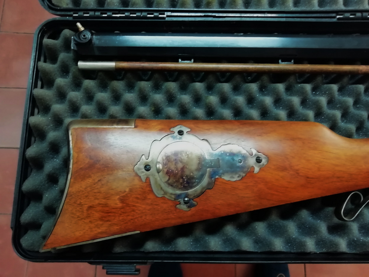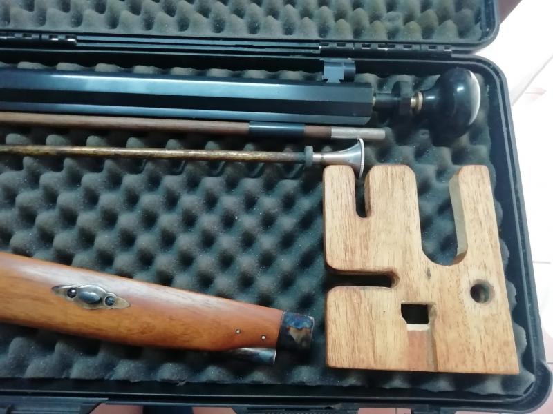 Se incluye maleta de transporte, baqueta de carga y limpieza en latón, con salvabocas, embudo de carga, iniciador, llave de chimenea, y tabla de sujección para el puesto de tiro.