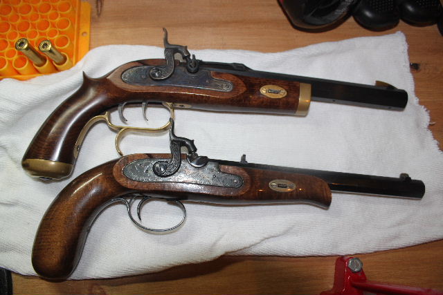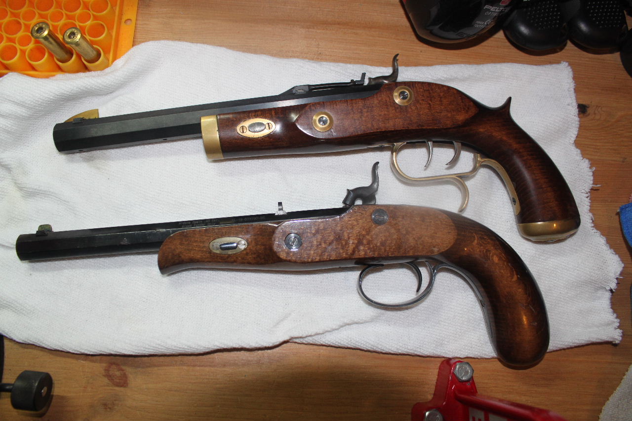 Funcionamiento perfecto y tanto metales como maderas están en perfecto estado, ádemas regalo con la compra un soporte para cargarlas, las vendo por dejar de tirar en arma corta de avancarga, solo tiro con rifle un Hawken.